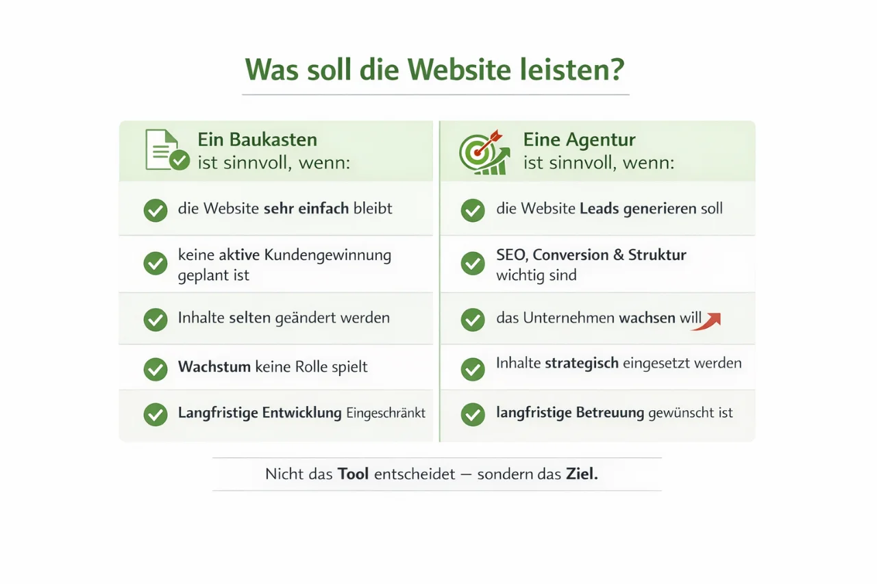 Baukästen binden an Plattformen, Tarife und Funktionsumfang. Agenturen binden an Wissen, Erfahrung und Prozesse. Der Unterschied ist entscheidend:
