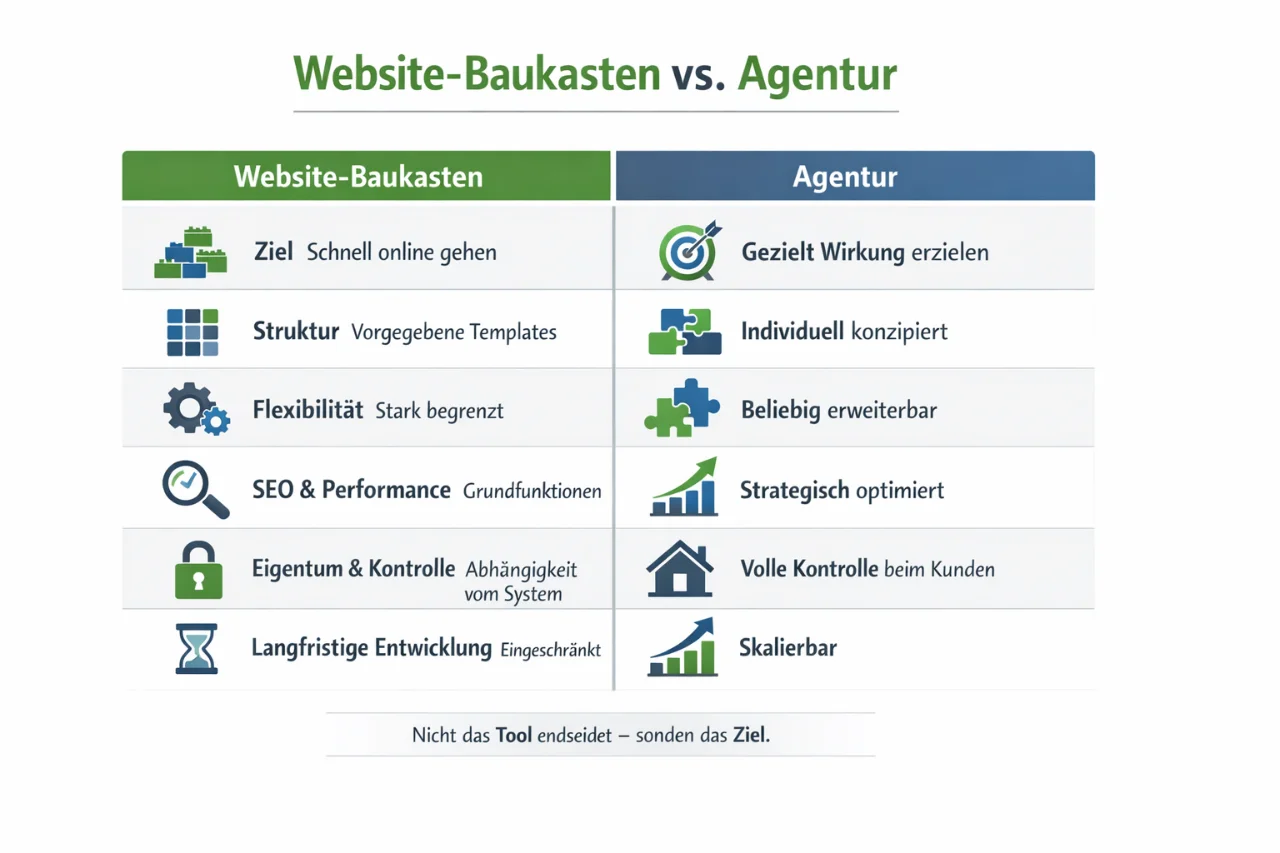 Die Entscheidung zwischen Website-Baukasten und Agentur gehört zu den grundlegendsten Fragen im Webprojekt. Sie wird oft emotional geführt und selten sauber eingeordnet. Baukästen werden als billig und oberflächlich dargestellt, Agenturen als teuer und komplex. Die Realität ist deutlich differenzierter.