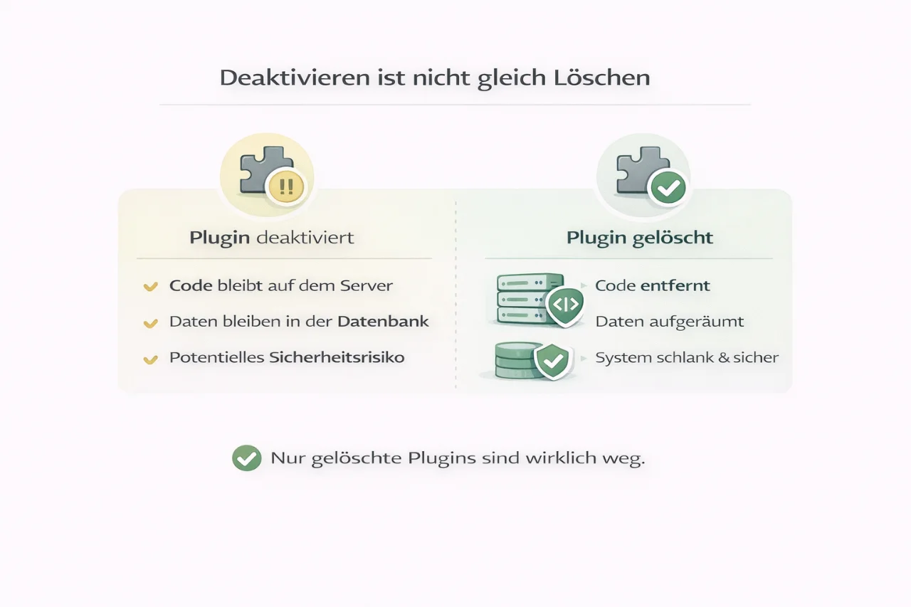 Wenn ein Plugin in WordPress deaktiviert wird, ist seine Funktion zwar abgeschaltet, der Code bleibt jedoch vollständig auf dem Server. In vielen Fällen bleiben auch Daten in der Datenbank bestehen. Einstellungen, Tabellen oder Einträge, die das Plugin angelegt hat, verschwinden nicht von selbst.