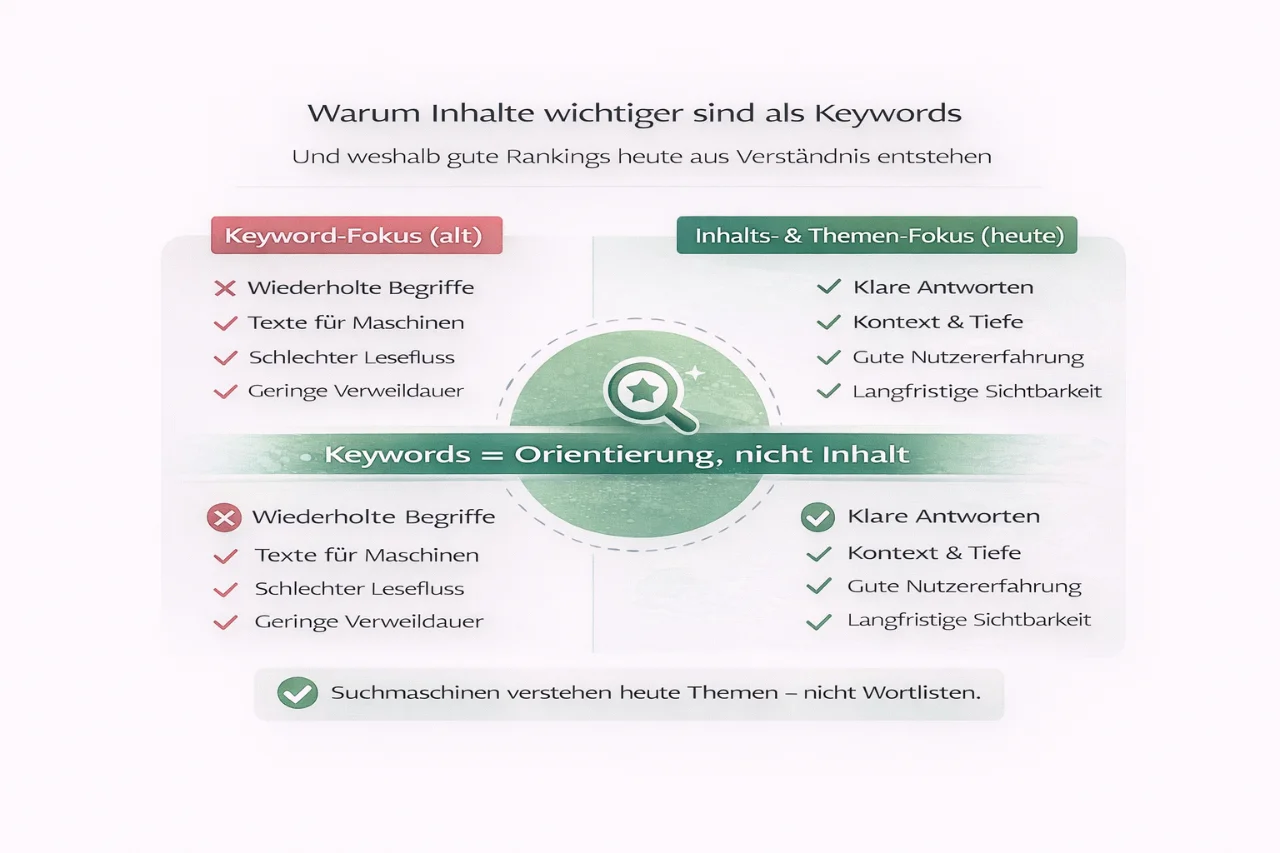 Lange Zeit galt SEO als reines Keyword-Spiel. Wer ein bestimmtes Wort oft genug platzierte, konnte damit gute Rankings erzielen. Diese Zeiten sind vorbei. Suchmaschinen haben gelernt, Inhalte zu verstehen, Zusammenhänge zu erkennen und Qualität einzuordnen. Genau deshalb stehen heute Inhalte im Mittelpunkt, nicht einzelne Begriffe.