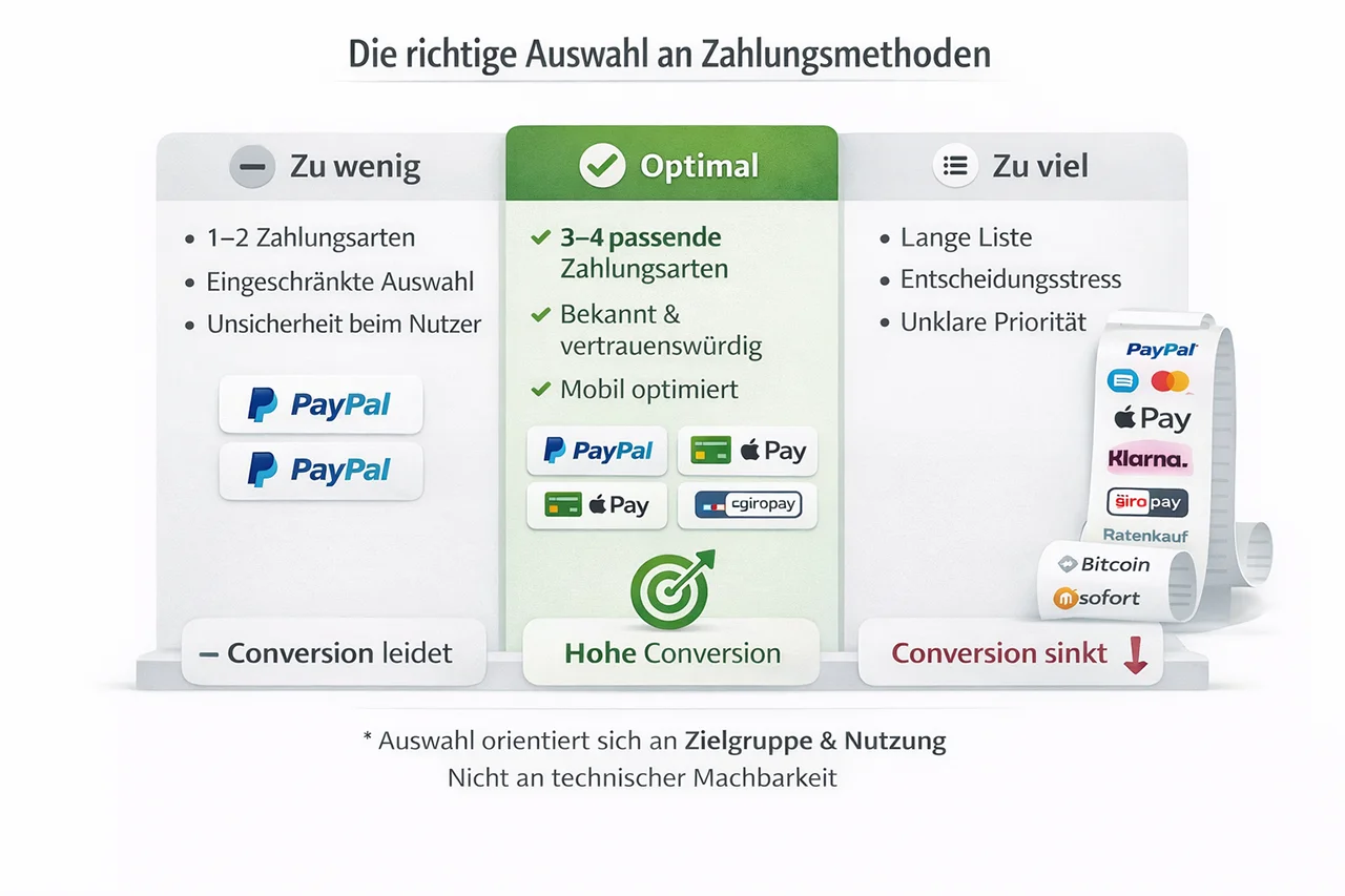 Das andere Extrem ist eine endlose Liste an Zahlungsmethoden. Kreditkarte, mehrere Wallets, regionale Anbieter, Ratenzahlung, Vorkasse, Rechnung. Was gut gemeint ist, führt oft zu Überforderung.
